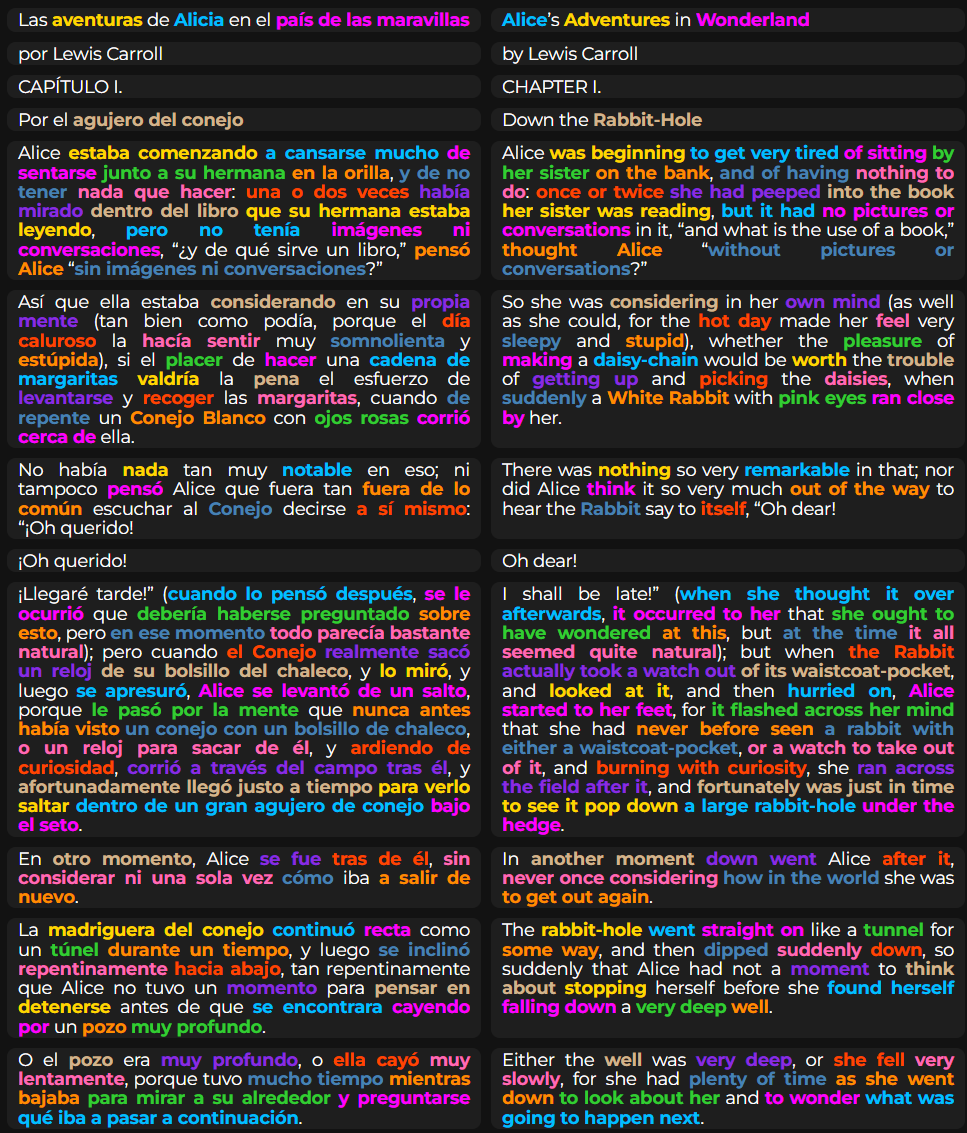 Create side-by-side pages with smart color links so you can read in your target language without breaking flow.